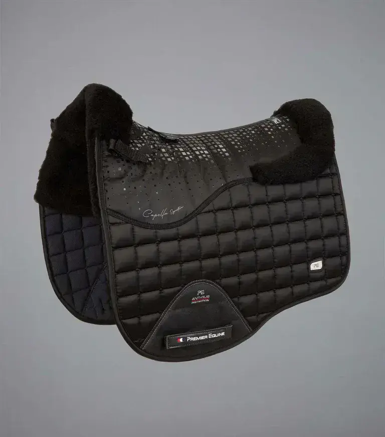 Home / Approved Brands / Premier Equine / Premier Equine Capella Close Contact Merino Wool Dressage Saddle Square Premier Equine Capella Close Contact Merino Wool Dressage Saddle Square Product Code: 3047BLK Stock Status: In Stock Product Code: 3047BLK Stock Status: In Stock Colour: Black / Black Wool Navy / Natural Wool Grey / Black Wool Wine / Navy Wool Brown / Natural Wool White / Natural Wool Size: Full £100.32 £114.00 Add to your Wish List You will earn 100 points with this purchase Description A sophisticated satin dressage saddle pad with anti-slip gel and Grade 1 Merino Wool. Crafted with a luxe quilted satin outer fabric that elegantly sheens in the light this dressage saddle pad boasts signature styling for a supreme finish. The under-saddle section features a silicone print gel that has been incorporated to prevent your saddle slipping and adjustable Velcro D loop straps and Velcro girth straps allow you to secure your saddle pad to your saddle. Half lined with fibrous grade 1 Merino wool which has the ability to absorb up to 30% of its own weight in moisture, keeping your horse dry and comfortable under saddle. Real wool is still one of the most technically advanced materials in the world and probably the best you can use under a saddle pad. Our spine design has been developed to reduce pressure points and provide the best protection for your horse. With a larger surface area covering the entire under-seat panel region, the natural fibres will effectively wick away moisture from the skin, distribute pressure evenly and aid shock absorption. The underside of the pad is engineered with our highly absorbent Air Tech mesh lining and the wicking fibres present in the filling draw moisture away from the skin, helping to keep your horse comfortable during ridden work. The soft satin binding on the saddle pad has been designed as a comfort feature to contour to the horses shape and prevent rubbing. Additional anti-slip protection and anti-rub exist in the form of the 600-denier polyester girth protection panel. A dressage saddle pad for the rider that seeks technical performance and luxe styling from their equipment. Your Capella Close Contact Merino Wool Dressage Square has been carefully hand packaged in a complimentary, reusable zip-fastened storage bag to keep your tack room tidy when not in use and for easy carrying. High wither design Tech grip anti slip gel features Quilted outer Half lined with grade 1 Merino wool Luxury satin finish Wicking fibre fill Anti-static & anti-bacterial lining Air Tech mesh lining Desirable detailing Premium PE branded brooch Anti-rub protection Length = 66cm, Depth = 56cm Comes inside a complimentary, reusable zip-fastened storage bag Attributes Colour: Black Brand: Premier Equine Product Code: 3047BLK