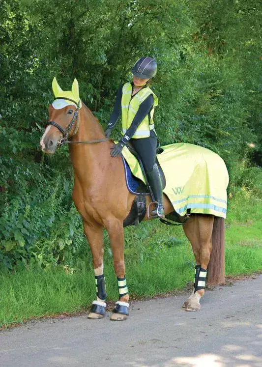 Home / Approved Brands / Woof Wear / Woof Wear Winter Hi Vis Exercise Sheet Woof Wear Winter Hi Vis Exercise Sheet Product Code: WS0033-VZYE-XS Stock Status: In Stock Product Code: WS0033-VZYE-XS Stock Status: In Stock Size: XS S M L XL Colour: £61.59 £69.99 Add to your Wish List You will earn 61 points with this purchase Description Designed for maximum visibility in all lighting conditions, this exercise sheet features high visibility yellow fabric with reflective strips that light up in car headlights, helping to keep horse and rider safe. The 6mm fleece lining provides warmth for your horses quarters in cold weather, while the 300D outer is both waterproof and breathable for all-weather performance. Ideal for hacking or roadwork during low-light conditions, this sheet combines protection, comfort and peace of mind.FEATURESThe innovative wraparound design fits neatly around the front of the saddle with a secure closureA triple security system prevents flapping in windy conditions with three-point fastening: an adjustable, removeable belly strap, a rear fillet string, and a unique tail loop that cleverly holds the tail flap in place for added protectionHi vis and reflective materials enhance visibility for safety during low-light ridesThe 6mm thermal fleece lining keeps your horses muscles warm in chilly conditionsThe durable 300D outer shell is built to withstand everyday wear and tearWaterproof up to 300mm, the sheet keeps your horse dry in wet conditionsBreathable material allows moisture to escape, maintaining comfortReflective Woof Wear branding adds a stylish safety detail that stands outCARE INSTRUCTIONSMachine wash max 30°C, gentle spinWash using a non biological washing detergentDO NOT tumble dryDO NOT leave in strong sunlightSize Guide Attributes Colour: Hi Viz Yellow Brand: Woof Wear Product Code: WS0033-VZYE-XS