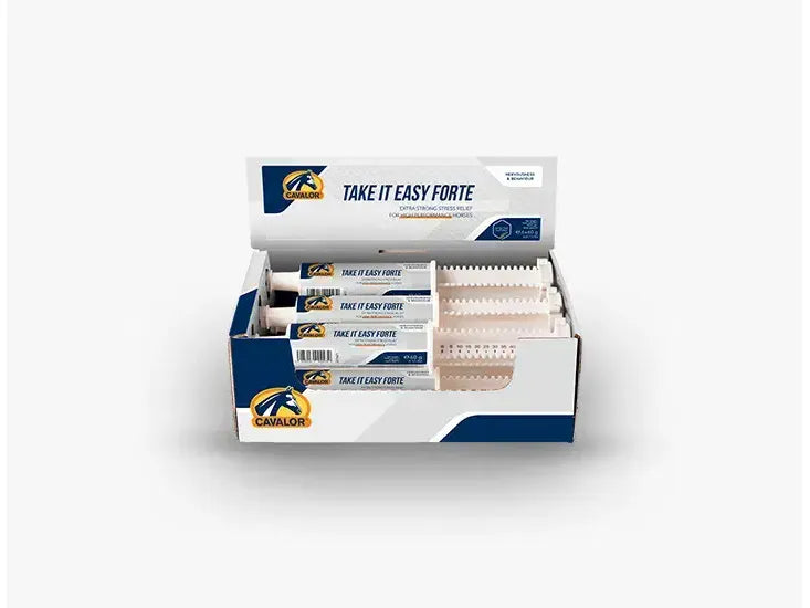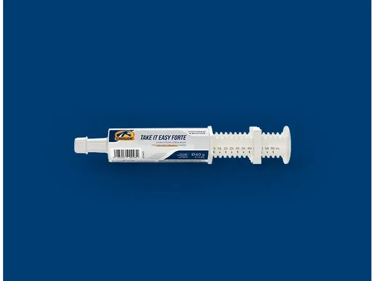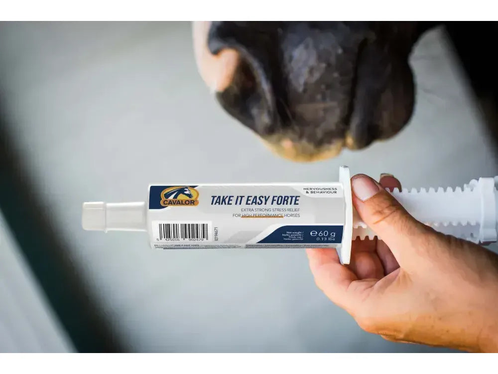 Cavalor® Take It Easy Forte offers a way to help with occasional stressful situations. It contains calming essential oils and supports general well-being by aiding in breathing and circulation. Like Cavalor® Take It Easy, Cavalor® Take It Easy Forte contains a high dosage of L-tryptophan in combination with B vitamins. This ensures a fast and efficient production of serotonin, an anti-stress hormone found naturally in the body. Take It Easy Forte in paste form is ideal to use ahead of stressful situations like competition and transportation.