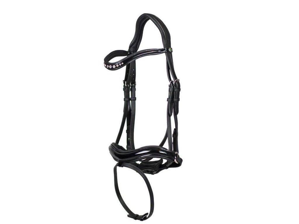 Monocrown snaffle bridle with patent wave crystal browband and anatomical raised patent crank noseband.This complete Snaffle bridle is part of our Ultra Comfort Leather range, hand-crafted from the finest quality leather, and treated with our unique eco-friendly hot press technique to infuse natural oils into the hide, ensuring a soft and luxurious leather finish.This bridle features a padded headpiece, noseband, and browband designed to mould comfortably to the horse's face, and relieve tension on the sensitive nerves around the ear and jaw.