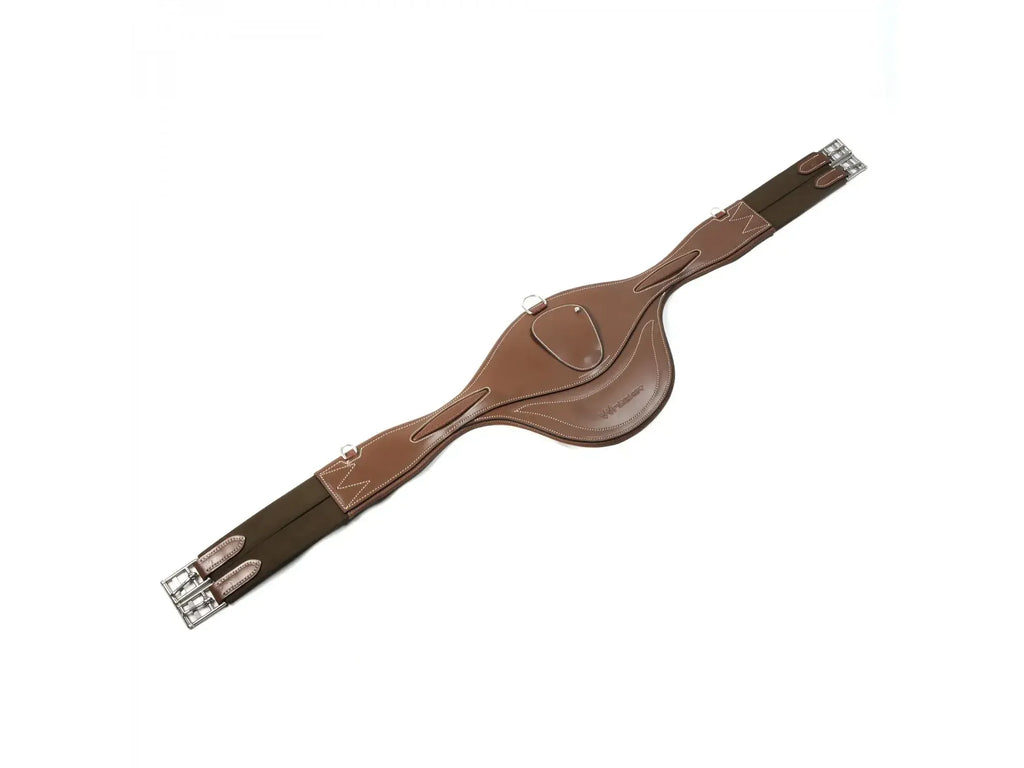 Jumping girth with large leather stud guard and lined with a quick-drying and breathable perforated leather padding, perforated leather decoration, contrast stitching throughout, central covered d-ring and 2x small d-rings either side.