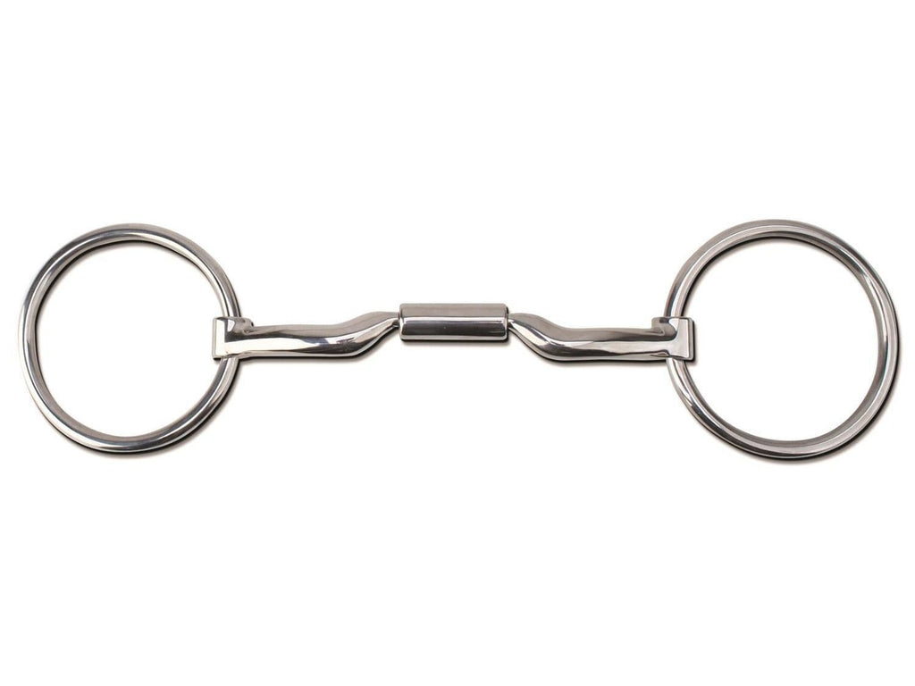 One of Mylers leading products. The MB04 low port comfort snaffle loose ring bit has a small, ¾ inch port for tongue relief. It has an ergonomic design creating a wrapping action around the bars and lips of the mouth, this avoids any pinch or nutcracker action as can be identified in a conventional snaffle. The MB04 has independent side movement allowing the horse to come through the shoulder and create lift with your horse coming up in front as the outlines lift comes through from behind and is collected into the riders hands in a soft and relaxed outline. The MB04 acts on the tongue with a certain amount of initial relief and the bars of the mouth while gently wrapping around the lips. This encourages the horse to flex, balance & relax at the poll. Ideal for a young horse as well as many other horses. The MB04 low port comfort snaffle loose ring bit encourages your horse to move with the bit as it wraps the outer lip. The loose ring version provides for a faster release for an even greater level of precision control and quicker release than the eggbutt version. The MB04 low port comfort snaffle loose ring is dressage legal.