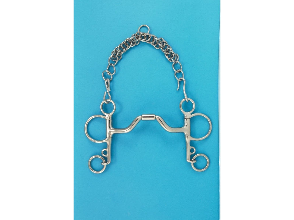 The stainless steel Pelham is designed to be used with two pairs of reins simultaneously. The headstall attaches to the purchase ring which keeps the cheek stationary. The first set of reins are the snaffle reins, which attach to the larger ring adjacent to the mouthpiece. The second set of reins are the curb reins, which attach to the smaller ring at the bottom of the shank. Thios bit comes with a curb chain.