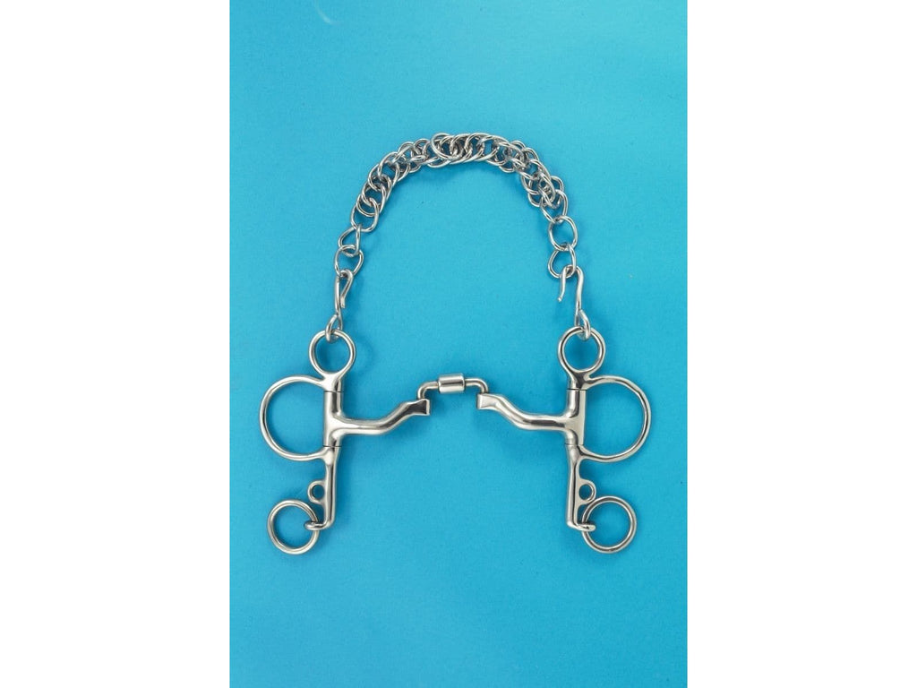 This is a curved mouthpiece with an upward and forward bend, two hinges and centre piece with barrel for Independent Side Movement. There's no restriction in degree of collapse. This offers lots of tongue relief to the compliant horse but will put downward pressure on top of bars when activated, followed by downward pressure on tongue and inward collapse on bars. This can also work well for the strong horse with head down low or into chest. Encourages horse up into bridle.