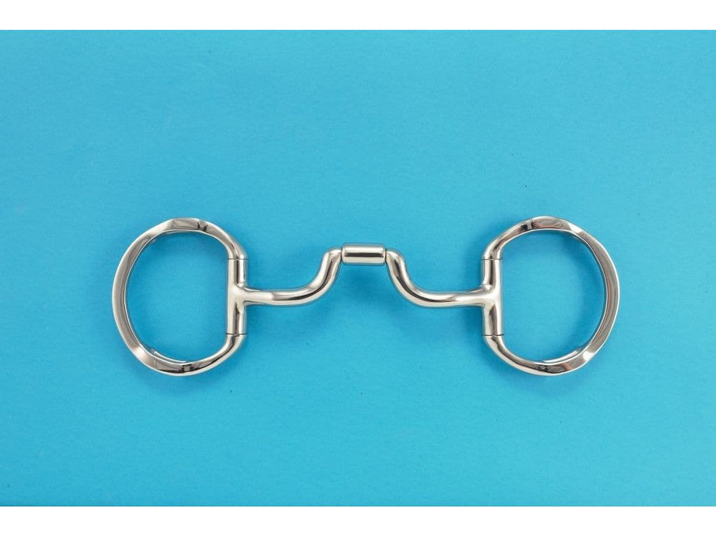 The Myler MB43LP Low Ported Barrel Narrow Eggbutt with hooks is a solid curved mouthpiece with 25mm (1 inch) port giving the horse adequate tongue relief in most cases, with a centre barrel for independent side movement allowing the bit sided to rotate perpendicular to the mouth piece giving the rider added assistance in lifting the shoulder by working the horse up into a more rounded outline. This bit will not collapse but it will roll down onto tongue when the horses head is too far forward encouraging the horse to come more on to the bridle. This Myler bit can be good for strong and keen horse who have a tendency to lean on the bit.