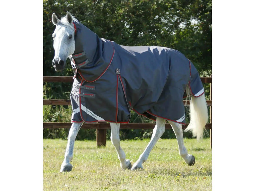 The Buster 50 is a highly versatile and traditionally styled lightweight turnout rug made from 840D ballistic nylon, making it suitable for use throughout the seasons. You can fix Premier Equine Rug Liners underneath this horse rug in order to increase warmth and thickness if needed. Treated with our proven waterproof system and optimum breathable formula, the rug helps to keep your horse warm, dry and comfortable in the field. Featuring elegant details such as branded stainless steel hardware and subtle contrast embroidery/trims. As part of the evolution of the Buster, a high shoulder gusset has been added to allow for a greater range of movement in the field.