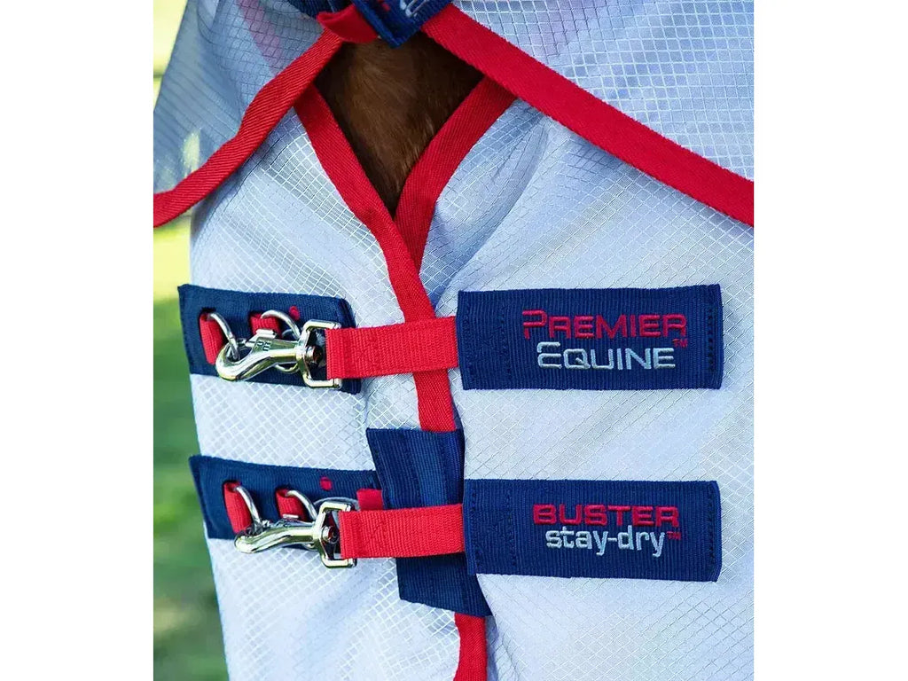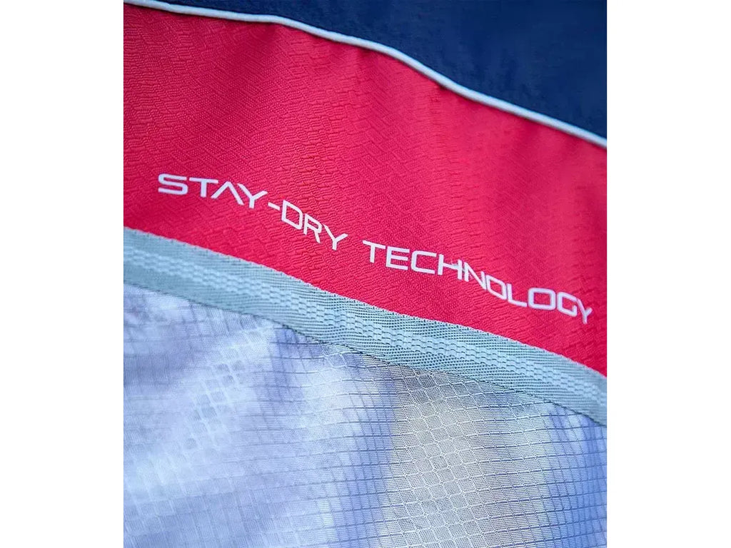 The Stay-Dry Super Lite Fly Rug combines contemporary styling with revolutionary super lightweight material. The upper section is made from a 600D ripstop waterproof and breathable material providing protection from rain showers. The lower section is made from 100% lightweight nylon approx. 70% UV reflective which offers incredible strength, durability and superior comfort designed to protect against flies and insects. This rug is the ideal choice for those summer days when the weather can't quite make it's mind up, rain showers one minute and sunshine the next and is perfect for those in-between days. It will help keep your horse dry from the showers whilst helping to prevent heat build up when the sun comes out. The perfect addition to any horse's wardrobe. This technically advanced, unique fly rug is secured using quick-release chest clips and cross surcingles.