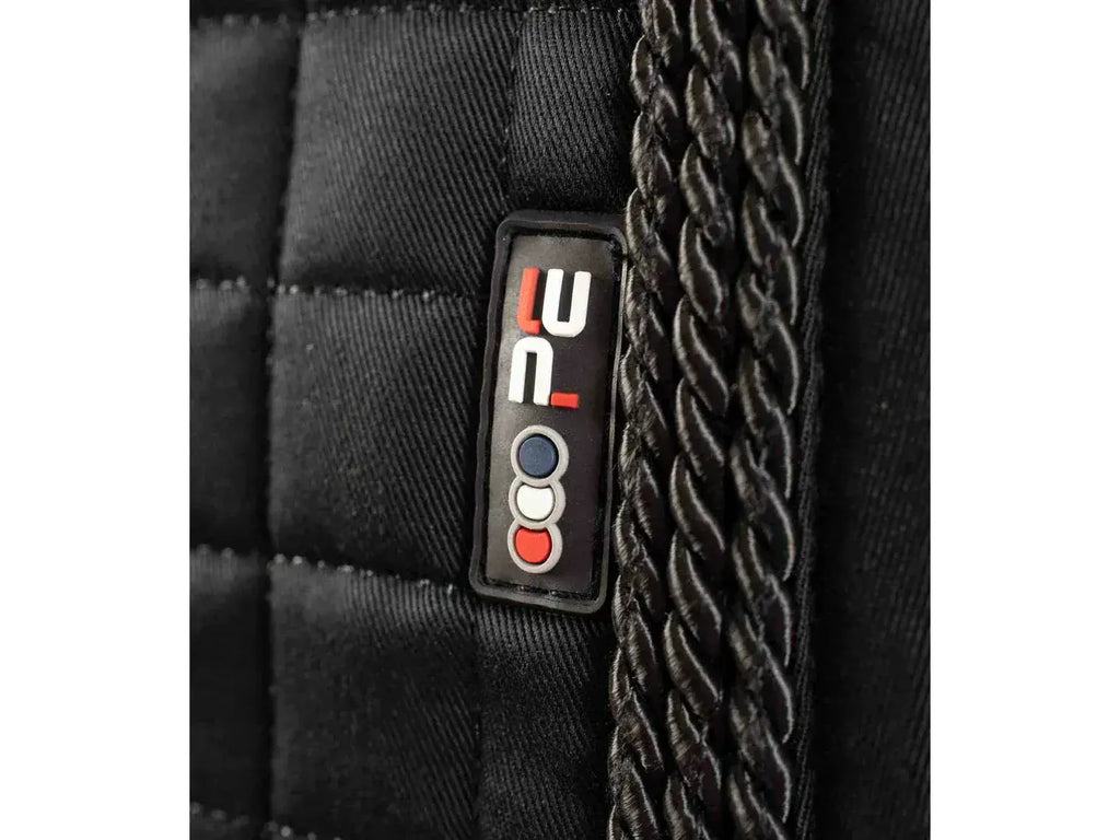 Moisture and sweat are drawn through the pad by wicking fibres present in the filling. A 600 denier polyester girth panel provides anti-rub protection. Complete with decorative twisted ropes, a cut away hem and double Velcro D loop straps. The ideal saddle pad for those wanting to make a bold statement in the equestrian field.