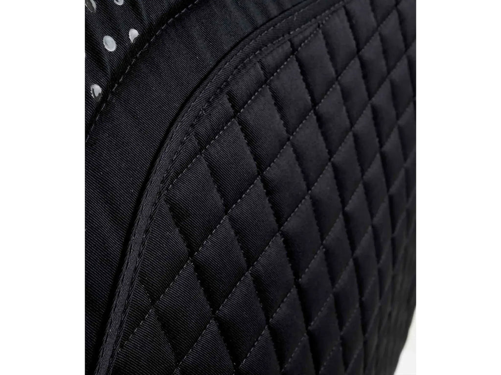 Patterned stitching on the quilted lower section gives the pad an exclusive look and feel. A 600 denier polyester girth panel provides anti-rub protection and our adjustable Velcro girth straps and adjustable D loop straps allow you to easily secure and adjust the pad to your saddle. The perfect anti-slip dressage square for everyday or competition use.
