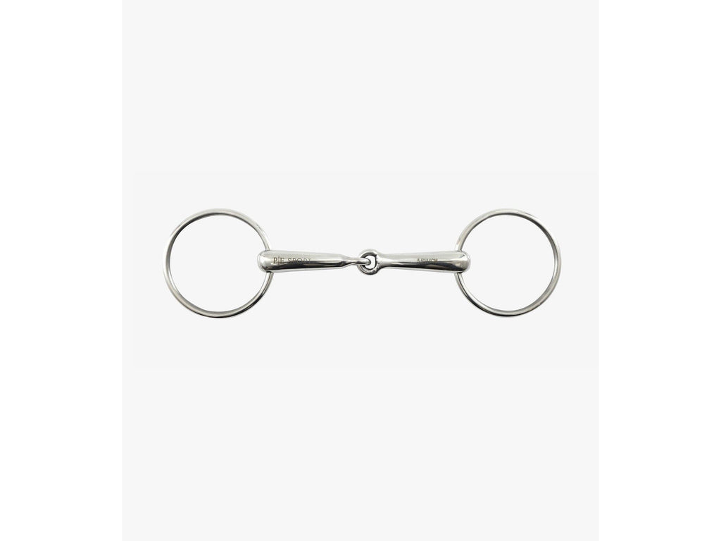 The hollow mouth race snaffle is extremely lightweight with large rings which make it particularly useful for preventing the bit from being pulled through the horse's mouth. A central single joint creates a nutcracker action that applies pressure on the bars of the mouth and the lips to aid with control. Loose ring cheeks are ideal for horses who lean or have a tendency to fix on the bit as they are highly moveable. This snaffle is perfect for race horses in daily training or for those who need a super lightweight loose ring snaffle.