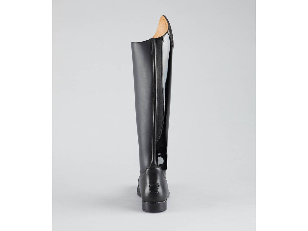 These exceptional long leather horse riding boots are crafted specifically for dressage from high-quality European and patent leather. The traditional knee-high length is embellished with patent leather around the outer calf and a metallic detailing at the knee. Offering a sophisticated appearance during everyday leisure riding, training, or competition use.