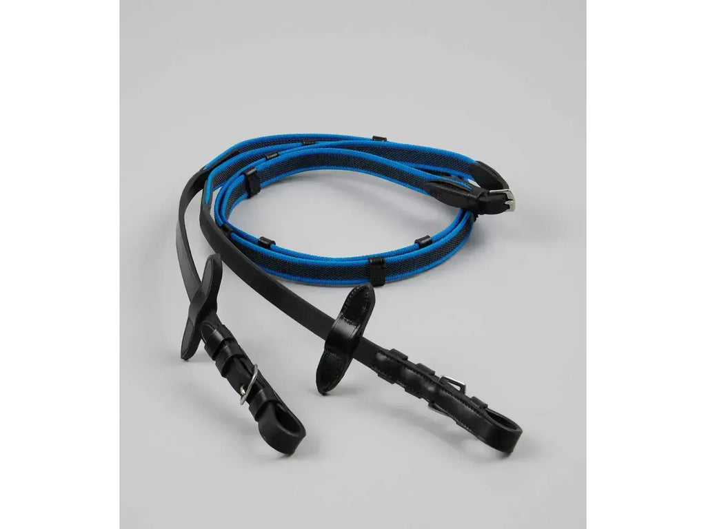 These reins come with stainless steel buckles and boast fine craftsmanship, making them both stylish and reliable. They are available in a striking black and electric blue colour combination, perfectly coordinating with the Mineo Snaffle Bridle for a polished and coordinated equestrian ensemble. The bold colour combination adds flair to the leatherwear, making it stand out in the arena or during training sessions.