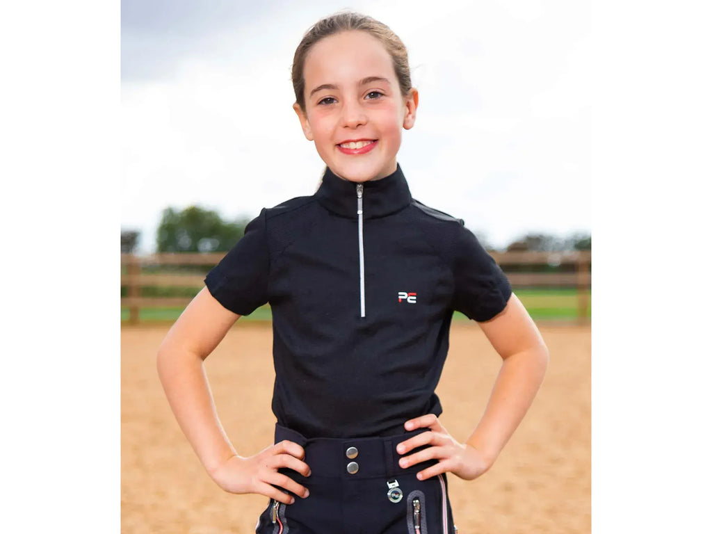 A short sleeved kids sports performance top crafted for the modern young equestrian.