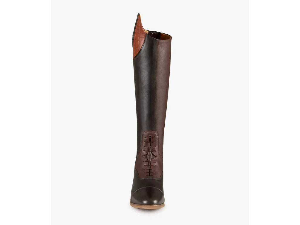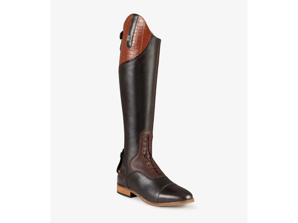The Passaggio design allows for a close-contact, contoured fit which elongates the riders leg and offers flexibility around the ankle through the addition of the modern elastic laced field boot design. German Aniline leather is integrated into the inside of the calf; aiding grip in the saddle and soft-touch communication with the sides of the horse.