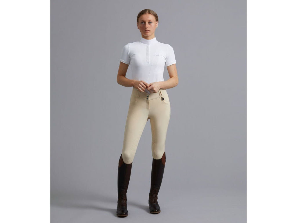 Engineered with a traditional four-way stretch fabric these ladies competition breeches are designed to perform, featuring an elegantly shaped high waist band which provides support to the riders core and aids in correct positioning, finished with double slider fastening for a flattening silhouette.
