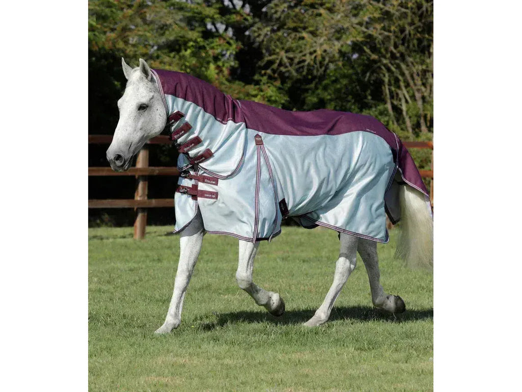 The Buster Stay-Dry Mesh Air Fly Rug combines waterproof and mesh materials. The upper section is made from a 600D ripstop waterproof polyester which provides protection from those unpredictable rain showers. The lower section is made from a lightweight and breathable sports mesh offering durability, comfort & air flow. A longer cut, integrated neck cover ensures your horse gets maximum coverage even when grazing and is secured with double locking Velcro straps. Antibacterial and anti-static polyester linings over the mane and shoulder help to prevent rubbing and are comfortable against your horses skin. Complete with cross over surcingles this innovative and breathable fly rug is perfect for keeping insects away on days where the weather may be unpredictable. Lower mesh section of this rug offers approx. 70% UV reflection.