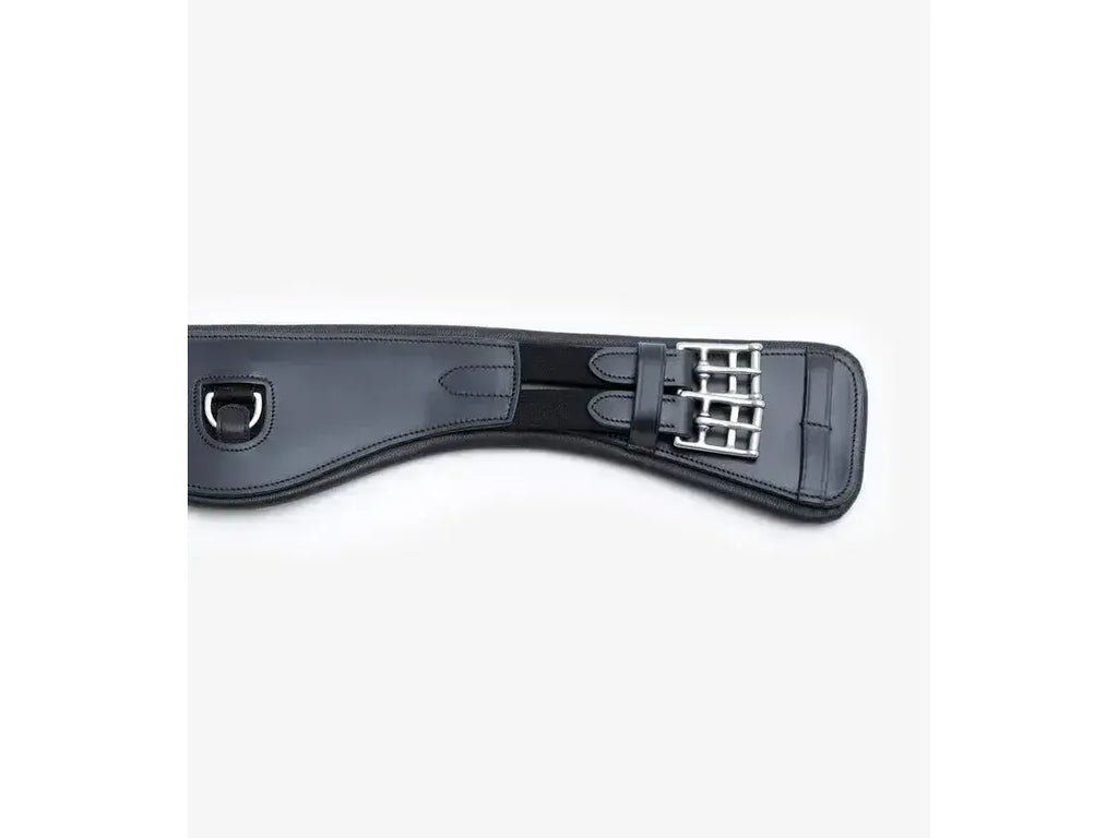 Anatomical shaping provides more room behind the horse’s front legs, decreasing restriction with the potential of increasing performance. Specifically designed for dressage saddles, monoflap saddles or saddles which have longer girthing straps. A central D-Ring attachment allows a martingale, breastplate or training aid to be attached if needed. Smooth leather panel work combined with high quality stitch lines provide a sleek, professional aesthetic. Finished with premium quality stainless steel buckles, this dressage girth is ideal for use on sensitive horses in everyday work or at competitions.