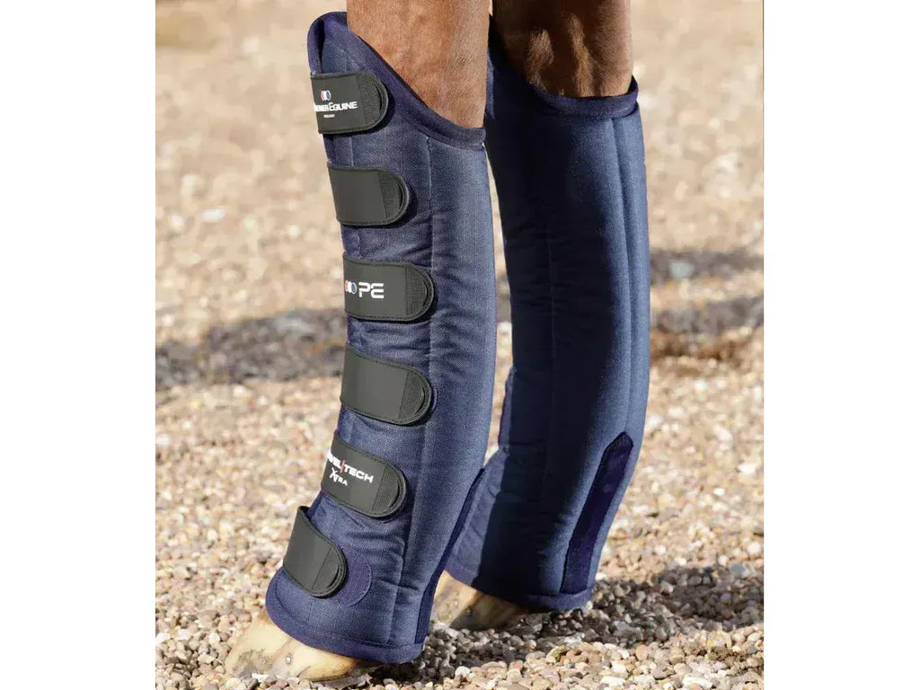 Our Travel-Tech Xtra Travel Boots are a traditional cut that aid in protecting the horse's knee and hock joints against scrapes and knocks when travelling. Made from 1200D ripstop polyester the boots still offer a great level of protection and excellent durability during travel. The fabric is quilted, which provides a cosy aesthetic and all four boots are sculpted around the fetlock for a secure fit. Lined with a luxuriously soft, moisture wicking material these horse travel boots offer decreased restriction but retain a high level of protection. The boots feature six Velcro tabs for secure and easy fitting.