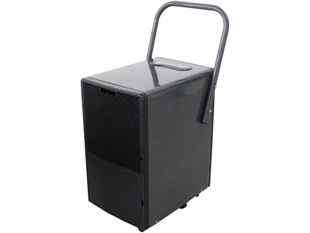 - Steel cased dehumidifier with 50 litre extraction, encompasses a removable plastic drain bucket and uses 407ºC refrigerant gas.