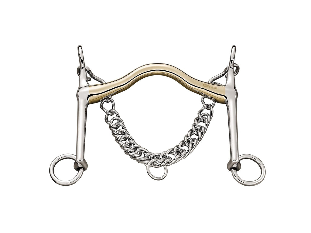 The 14mm thick Sprenger Sensogan Bemelmans Weymouth keeps the horse on the bit. It has a smooth, rounded port and the shape of the mouthpiece is adapted to the sensitive palatal arch. The thickness is
