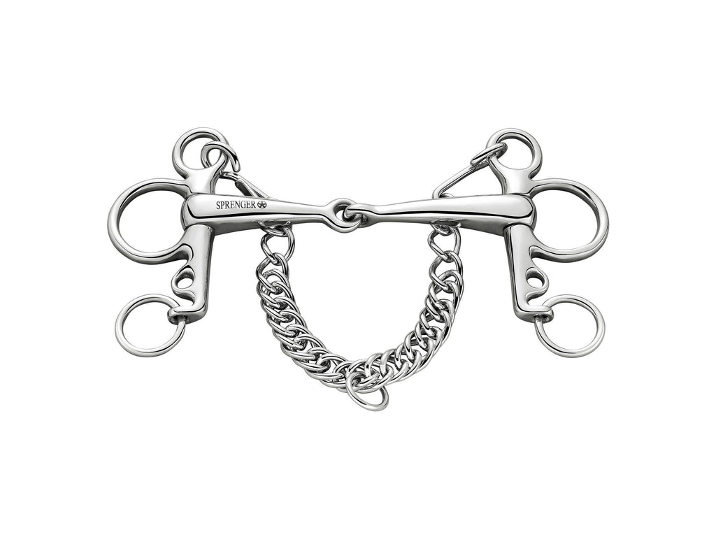 Sprenger Stainless Steel Short Shank Pelham is designed to add some leverage action and pressure on the poll using the bottom rein fixing as well as the main ring fixing for the primary rein action and as a result it offers more control with strong and powerful horses especially when used in conjunction with a curb chain.