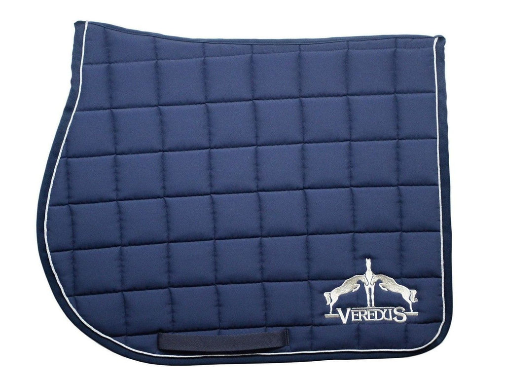 Jumping saddle cloth made from cotton and polyester with moisture-wicking padding.