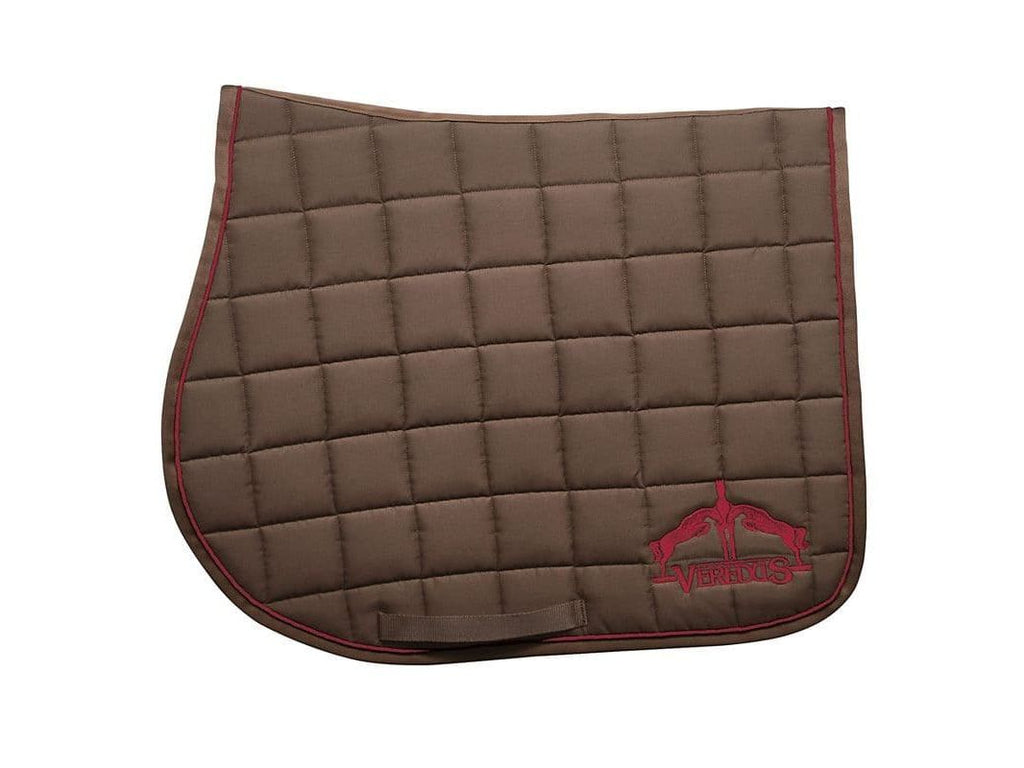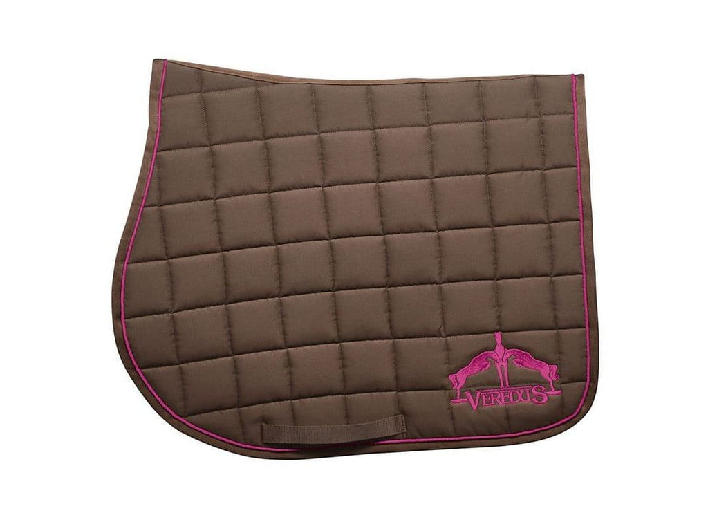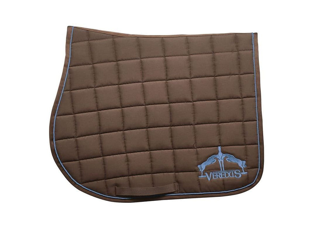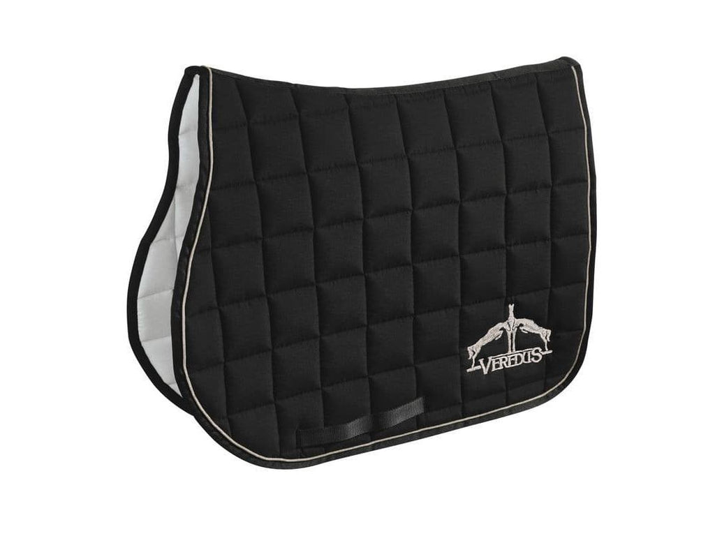 A jumping saddle cloth made from cotton and polyester with moisture-wicking padding.